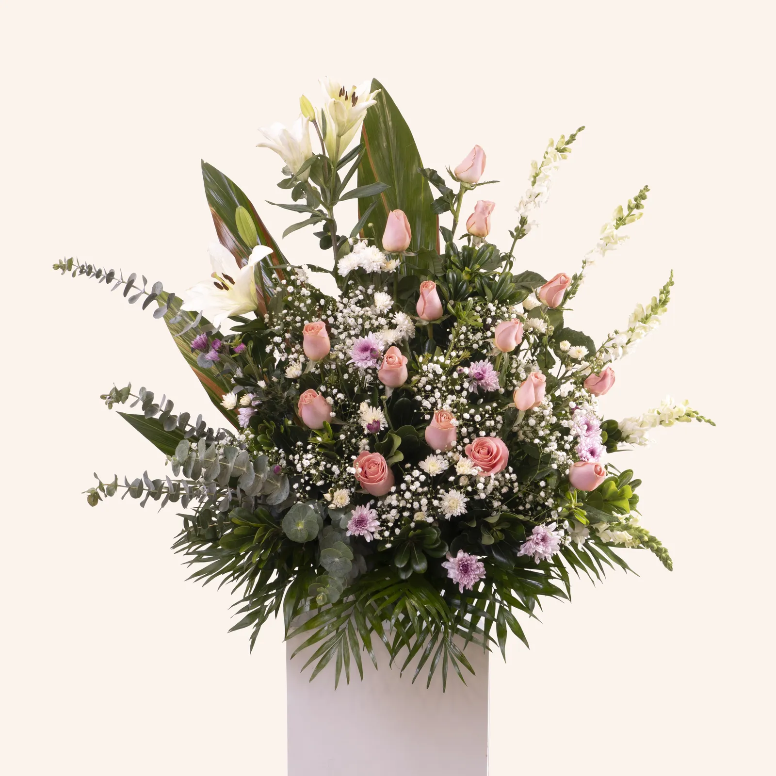 90 cm, 15 rosas, 2 lilis, surtido de flores, follaje fino