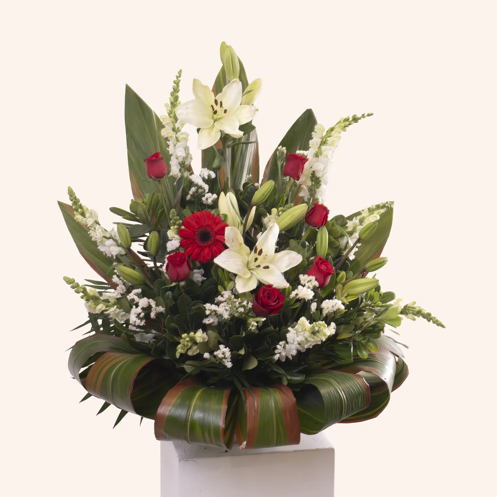 80 cm, 6 rosas, 5 lilis, surtido de flores, follaje fino